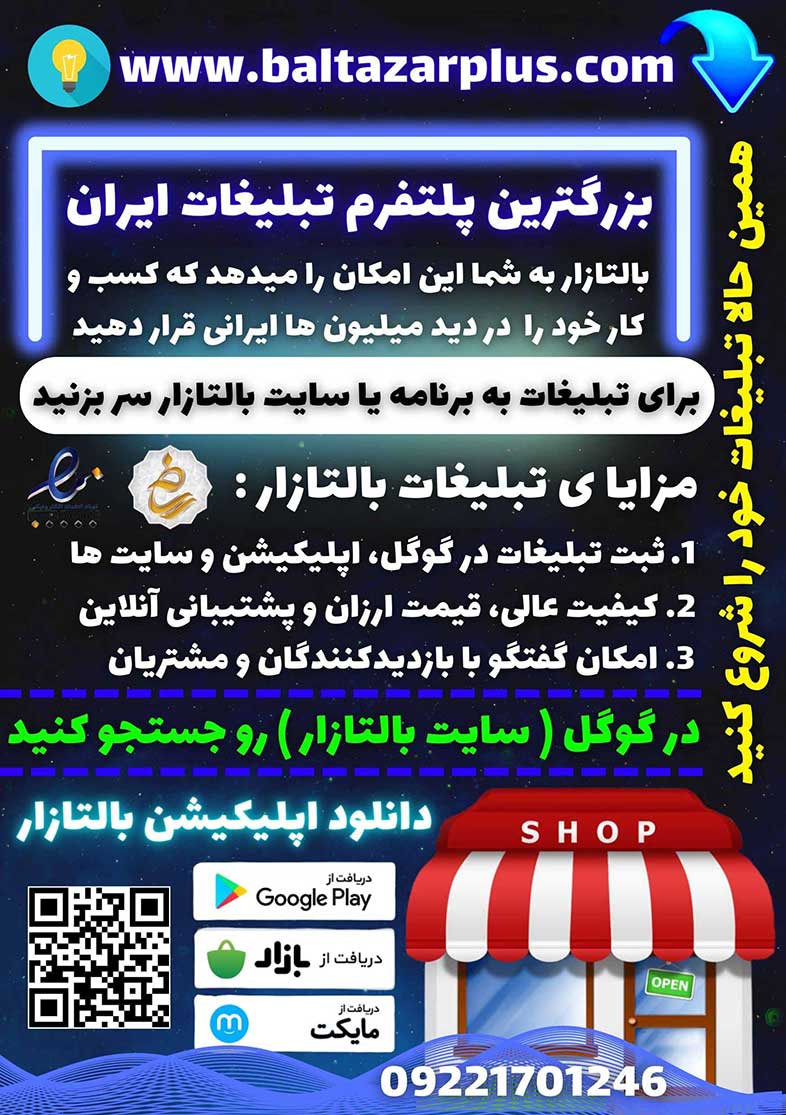 چرا باید تبلیغات کنیم؟ شما باید تبلیغات کنید چون تبلیغات میتواند باعث معرفی و شناساندن کسب و کار شما بشود به همین دلیل میتواند تبلیغ جزو مهمترین معیار های موفقیت شما باشد پس حتما باید روی تبلیغات کردن جدی باشید به همین دلیل ما برای تبلیغات شما سایت بالتازار رو پیشنهاد میکنیم برای ورود به سایت بالتازار فقط کافیه روی سایت تبلیغات کلیک کنید تا به سایت بالتازار هدایت بشوید.