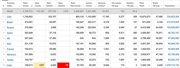 به گزارش گروه بین الملل خبرگزاری آنا ، تعداد دارندگان کورونا در سراسر جهان به 5،794،723 رسیده است. از این تعداد ، 357 هزار و 516 نفر جان باختند و 2499801 نفر نیز بهبود یافتند.
