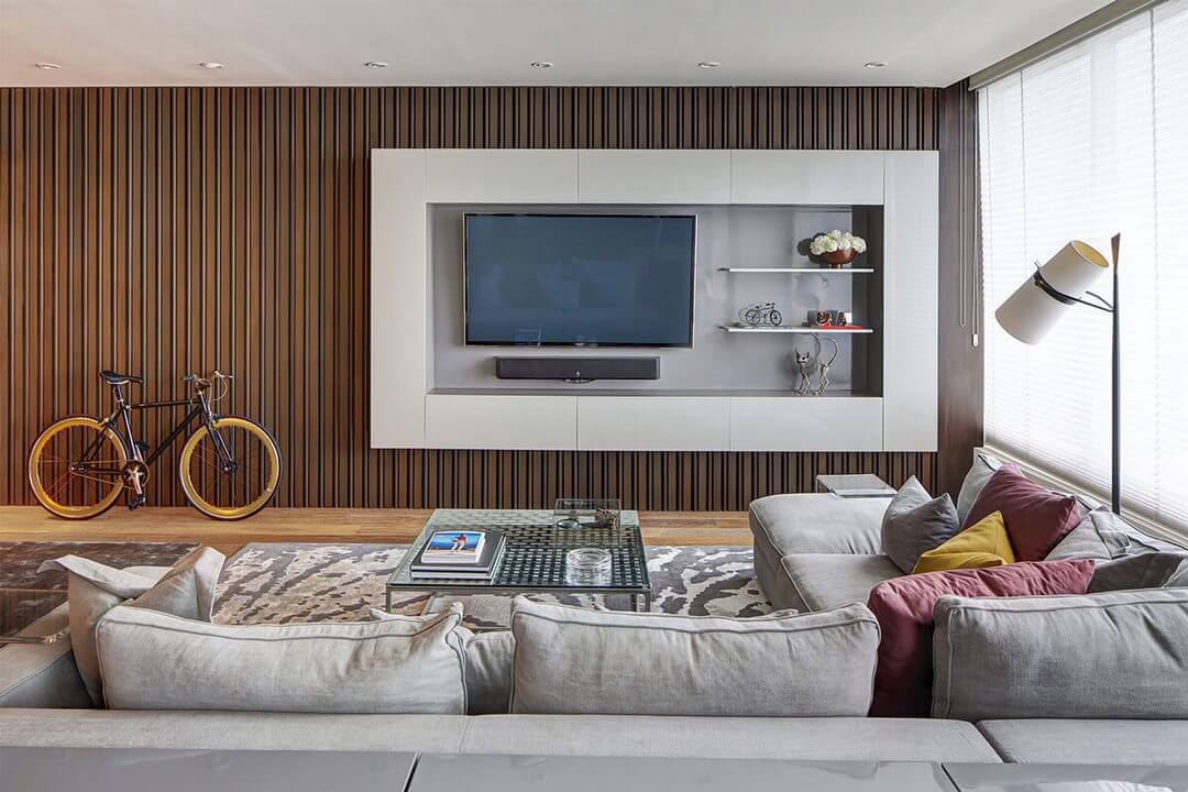 استفاده از پنل های ترمووود: ساده ترین و در عین حال شیک ترین ایده، استفاده از پنل های ترمووود برای پوشش کامل دیوار پشت تلویزیون است. این کار ظاهری گرم و صمیمی به فضا می بخشد و تلویزیون را به نقطه کانونی اتاق تبدیل می کند. می توانید از پنل های ترمووود فقط برای پوشش بخشی از دیوار، مانند نیمه پایینی یا نیمه بالایی آن استفاده کنید. این کار، تنوع و پویایی بیشتری به دکوراسیون شما می بخشد. همچنین با استفاده از پنل های ترمووود در اشکال و ابعاد مختلف، می توانید طرح های هندسی زیبایی را روی دیوار پشت تلویزیون ایجاد کنید. علاوه بر اینها قیمت ترموود پشت تی وی بصورت پنل، با توجه به لایه فومی زیر آن کمی گران تر است اما ظاهر بسیار زیبایی را به دیوار تلوزیون شما میبخشد.